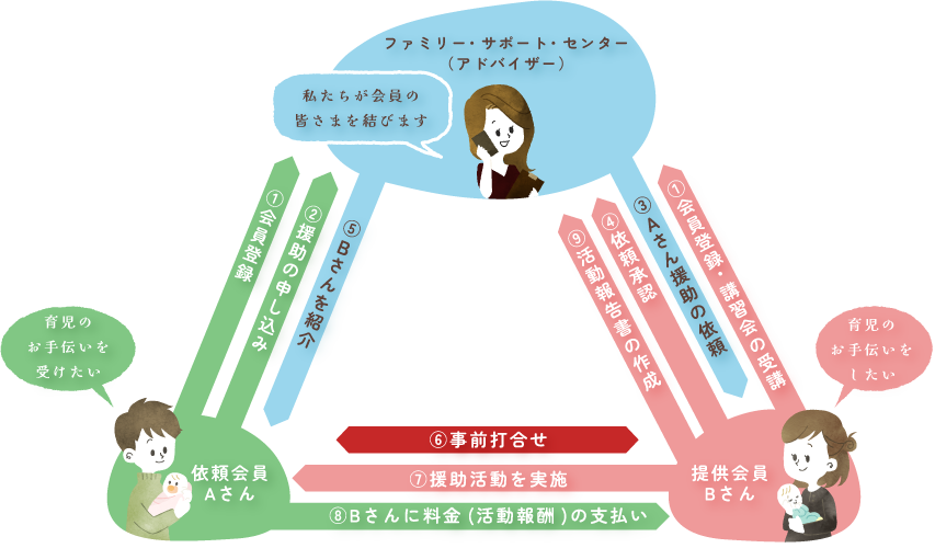 地域で子育ての支援をするために、依頼会員(育児の援助を受けたい人)と提供会員(育児の援助を行いたい人)が会員登録をし、地域において育児の相互援助活動(有償)を行う会員組織です。