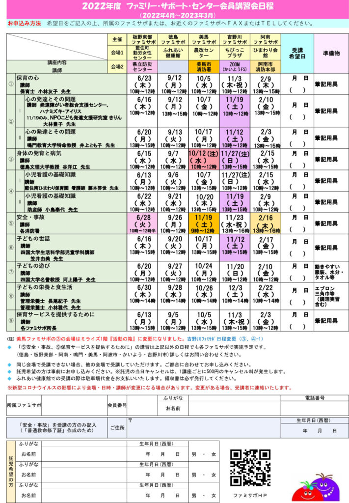 2022 ファミサポ講習会 日程、会場の一部変更